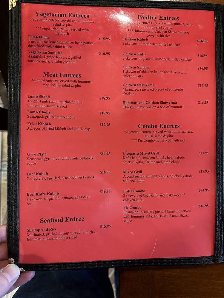 The menu at Cleopatra Grill and Hummus features a broad range of Mediterranean delights. From appetizers like Baba Ghanoush to flavorful shawarma and kabobs, options abound. Vegetarian plates provide something for everyone as well.