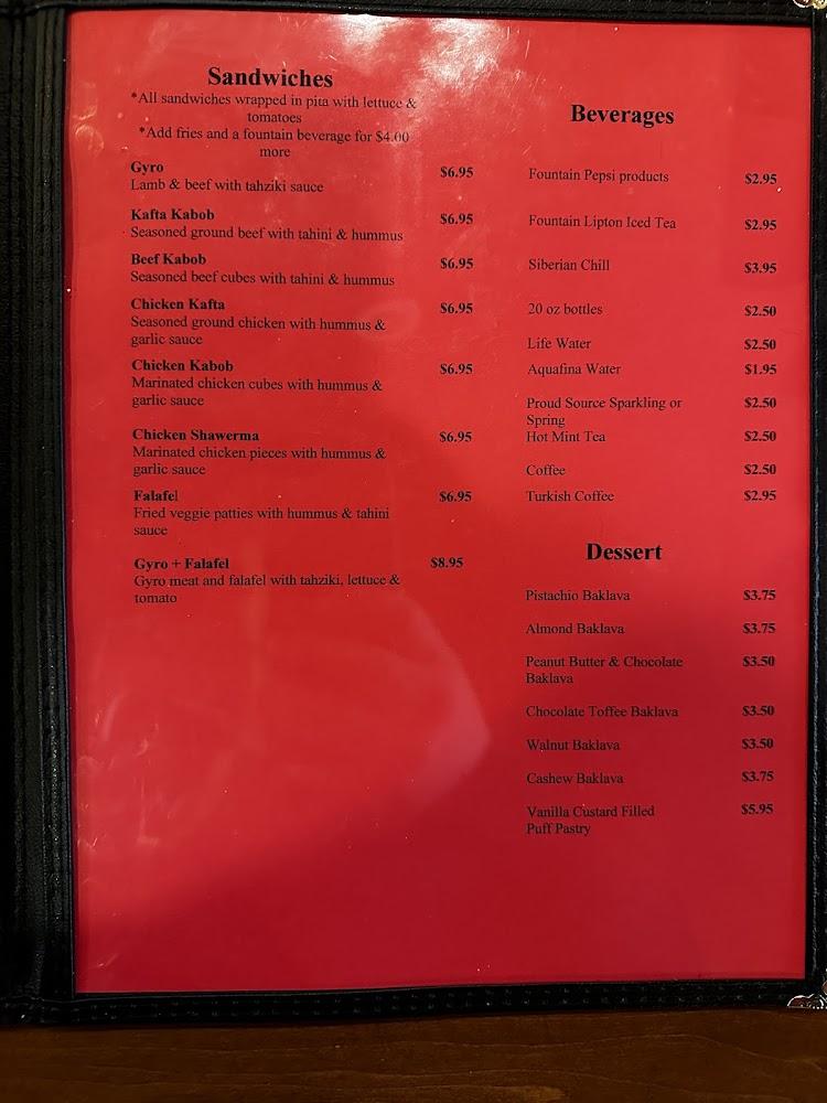 Signature dishes like the Gyro Sandwich and Falafel Plate grow in popularity. Pricing remains reasonable, with most items falling between $10 to $20. Desserts like Kunefe and various baklava types make the end of the meal delightful.