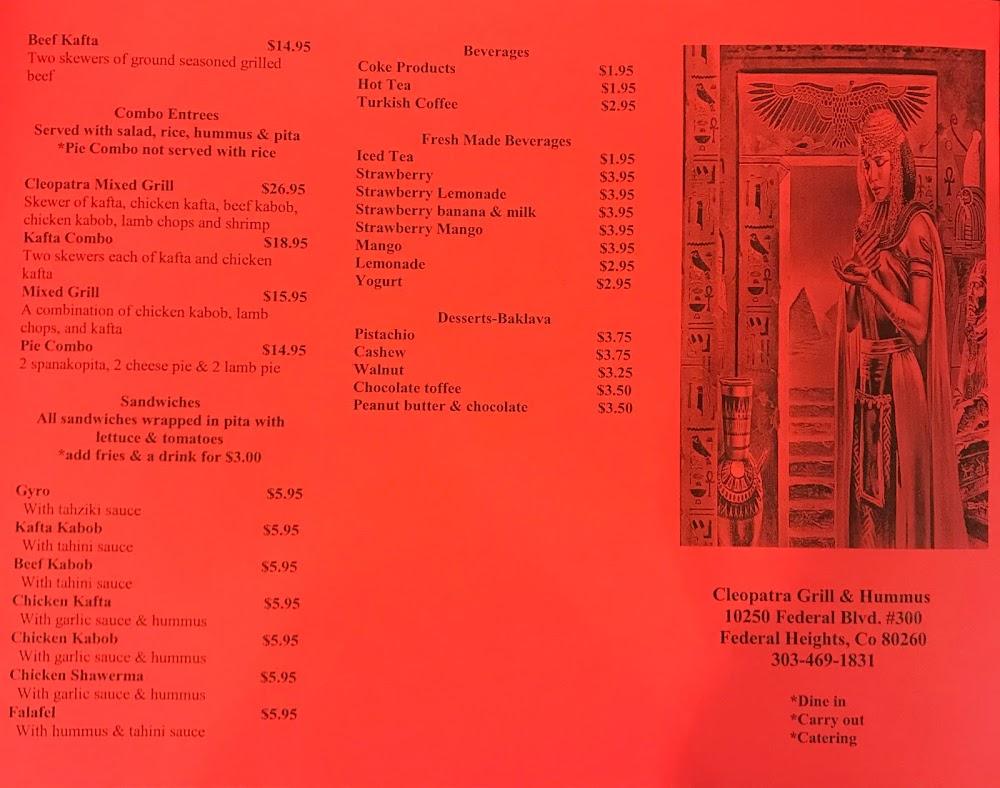 Welcome to Cleopatra Grill and Hummus, your destination for authentic Mediterranean cuisine in Federal Heights! Conveniently located at 10250 Federal Blvd, we specialize in mouth-watering gyros and a variety of Middle Eastern delights. Enjoy a relaxed atmosphere perfect for solo dining or group gatherings, with accessible seating and amenities for everyone. Our menu features vegetarian-friendly options, healthy dishes, and small plates to share. Experience hassle-free dining with takeout and contactless delivery services. Join us for lunch or dinner and savor the delightful flavors our passionate chefs prepare daily. Reservations are welcome!